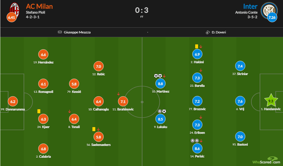 The match finished AC Milan 0-3 Inter, with two goals from Lautaro Martinez and one from Romelu Lukaku. The xG of this match was 0.80-2.51, showing us that AC Milan struggled to create high quality chances. Other than the first five minutes or so of the second half, in which captain and goalkeeper Samir Handanovic produced a number of world-class saves, Milan did not put Inter under any pressure at all.