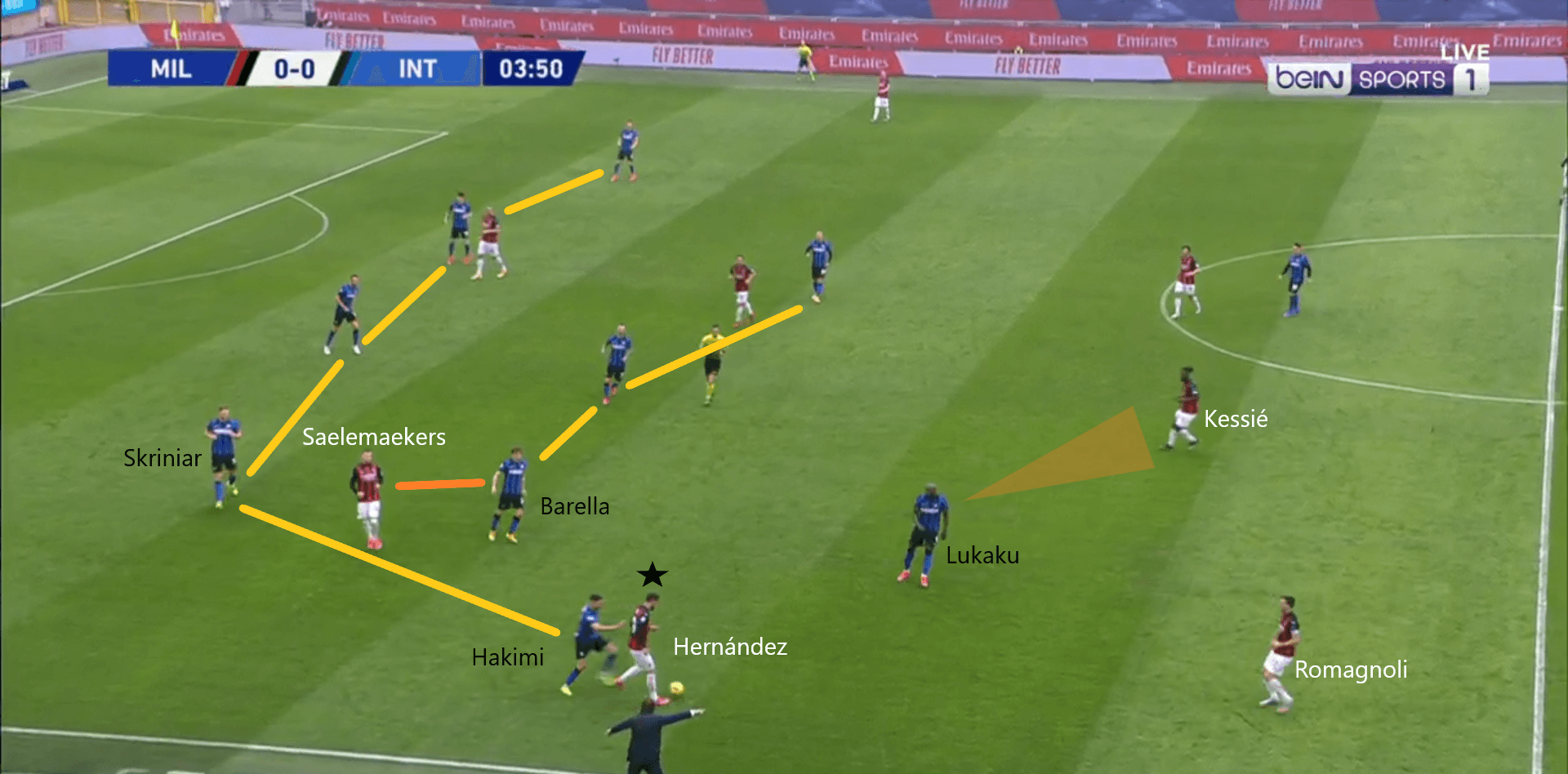 Below see AC Milan forced to use possession out wide. The Inter back five shifted to a back four as Hakimi pressed Hernández exclusively. Hakimi’s role in this match was to press Hernández in an effort to either force AC Milan to go backwards, or create a turnover in possession that allowed Inter to counter. Lukaku shields Kessié while Barella man-marked Saelemaekers. Hernández must go back.