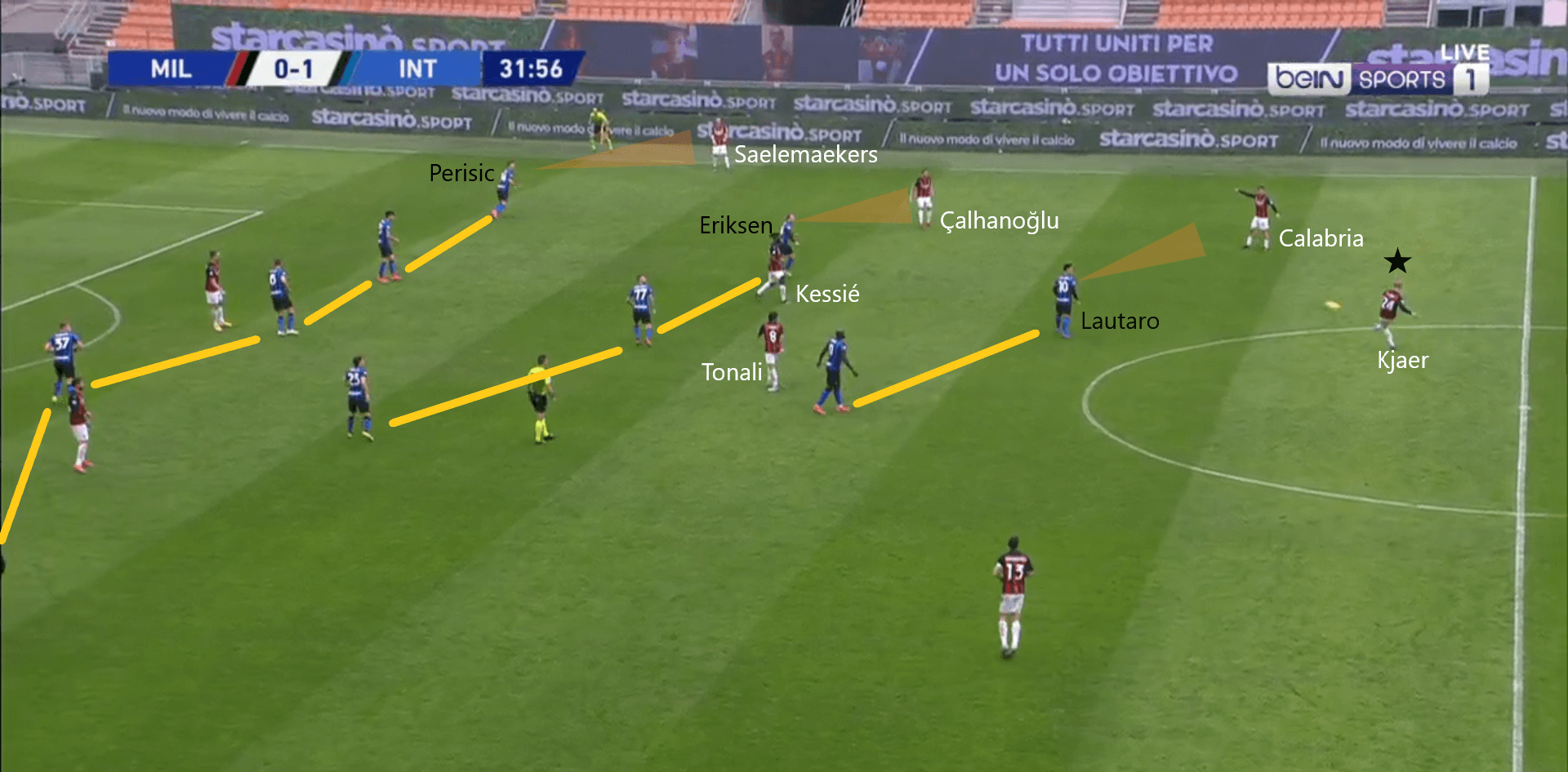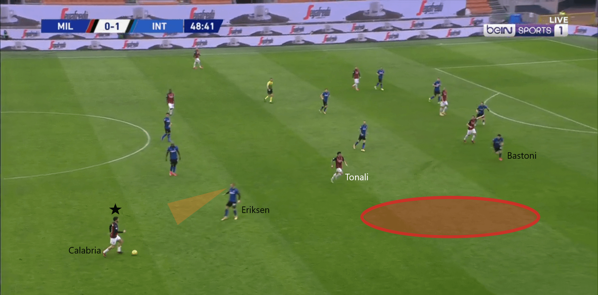 At half-time, Stefano Pioli noticed that Eriksen often pressed Calabria too soon and too aggressively in the first half, leaving space behind him that his team could exploit. Below we can see just that. Eriksen presses Calabria, leaving space for Tonali to run into.