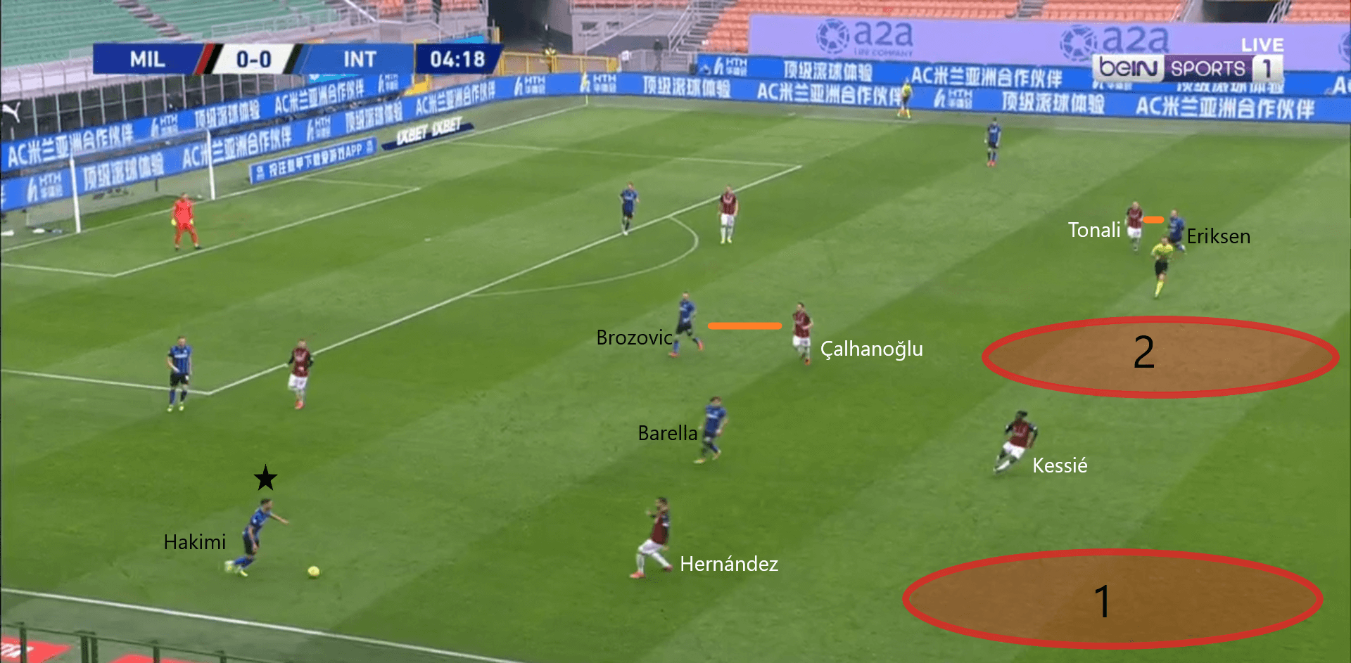 Now Kessié must defend the first space (labelled 1) which then leaves the second space (labelled 2) vulnerable. Brozovic is marked by Çalhanoğlu and Etiksen is marked by Tonali, which means that Kessié has to defend two spaces at once. No player can cover two spaces at once, so Hakimi was able to exploit this by combining with Barella and Lukaku as he dropped deep. Inter scored from this specific example, but they would also perform this movement several times in the match.