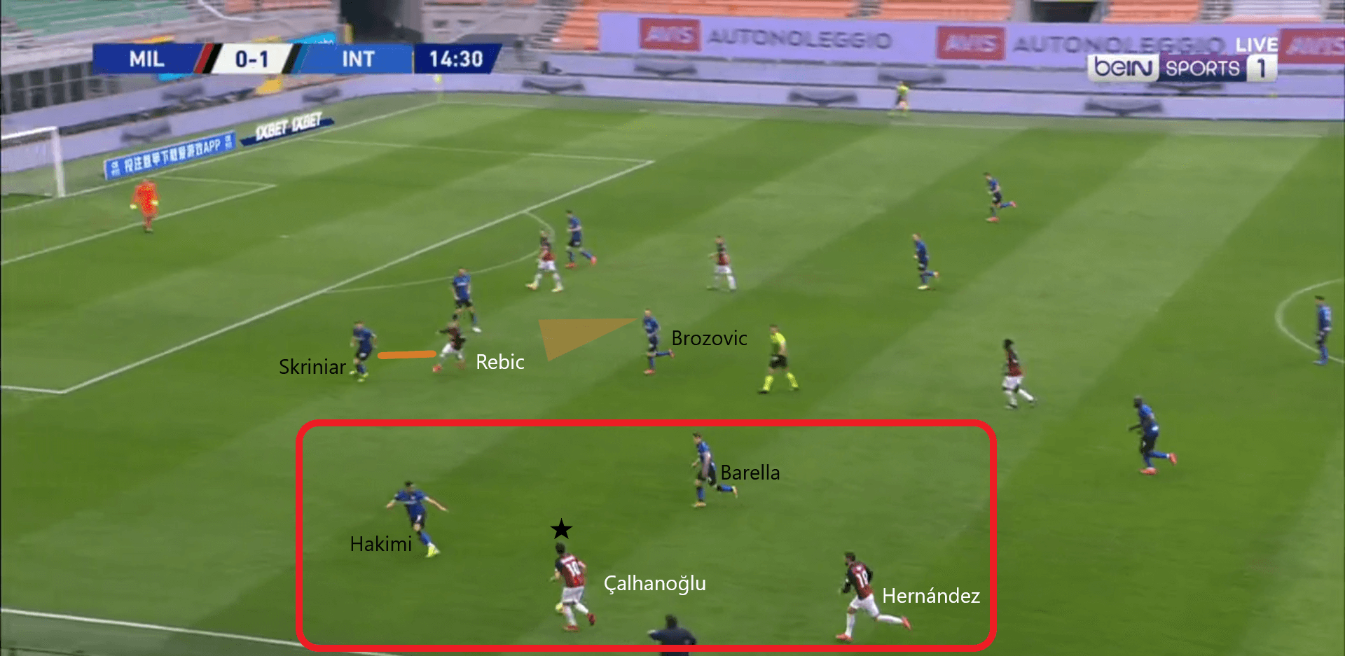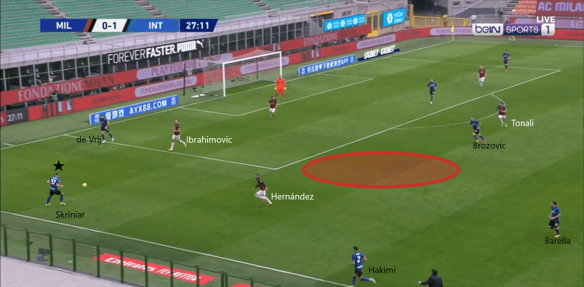We mentioned earlier that Hernández’s positioning was suspect, so here will analyze that. When Inter build-up play from the defense, they welcome the AC Milan press in an attempt to exploit the space left behind the pressing players. On the ball below is Hakimi being pressed by Hernández. The problem here is that Hernández leaves space behind him vacant for an Inter forward to drop into. Barella and Kessié both notice this.