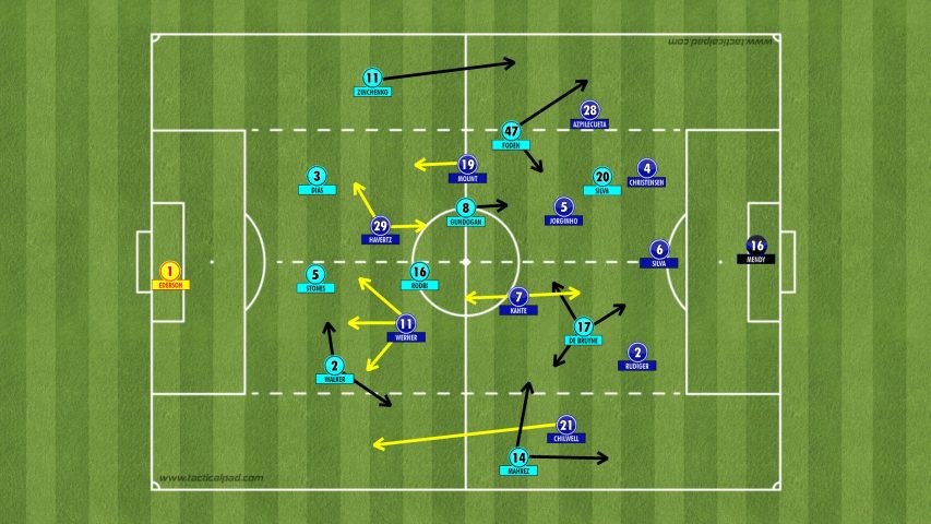 Whilst it is difficult to pin point the exact team selections of both sides, we can assume that City will probably have the edge in terms of ball retention and that their midfield will almost certainly contain Gundogan, De Bruyne and Foden. The big question is whether Pep opts for Fernandinho or Rodri in the CDM position. With the Brazilian he will have more progression from deeper areas but he risks his side being caught out on the counter...Mount and Havertz in particular could exploit this, seeing as they gave Casemiro a run for his money.