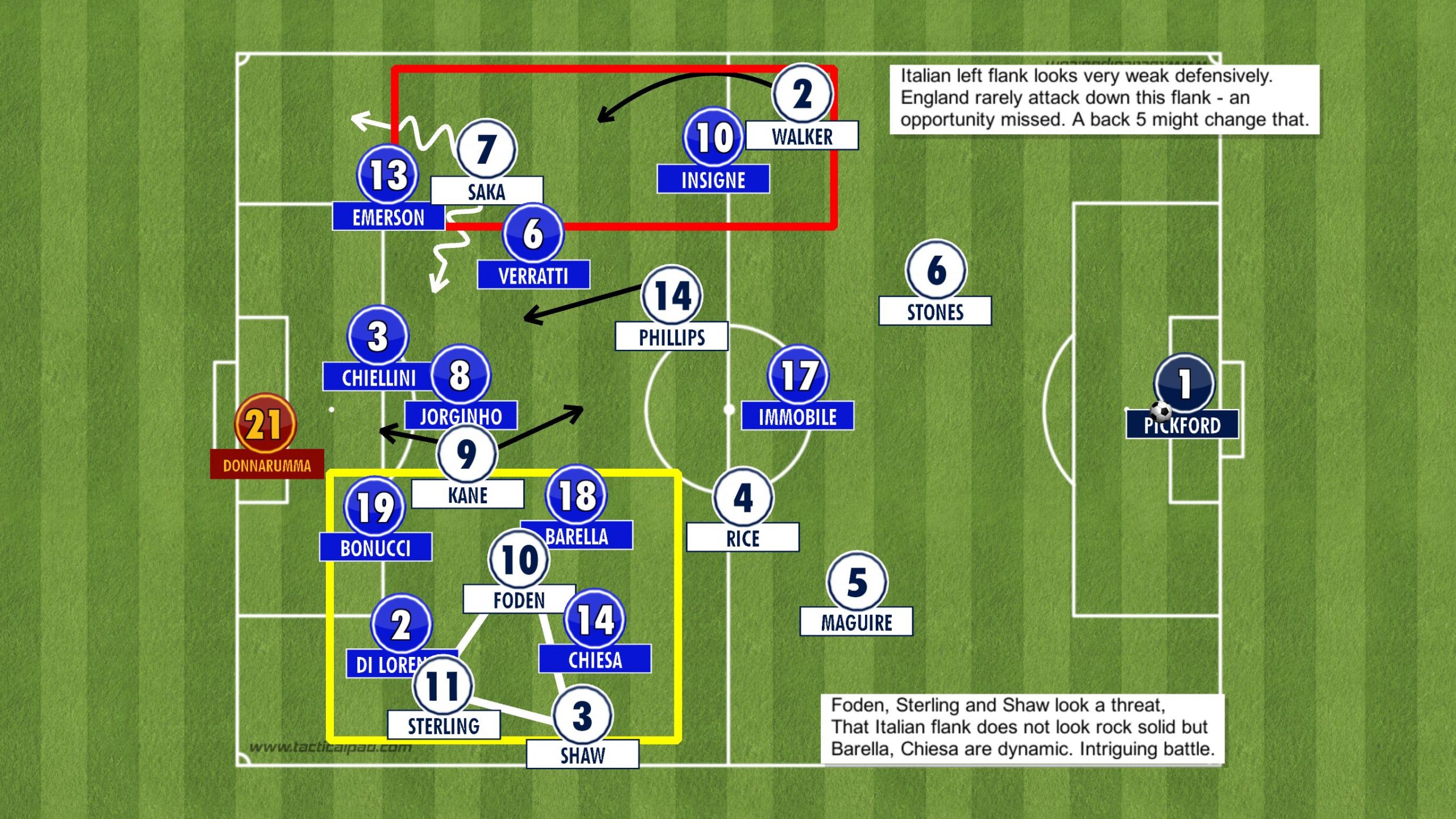 If the Italians succeed in suffocating Kane - which they should as in open play as Chiellini and Bonucci should have too much for him - the right flank and England's use of substitutes will be a decisive factor as to whether they can hurt this Italian backline. I criticised Saka in the game against Denmark for being too narrow and not dragging Vestegaard wide enough to exploit his clumsiness. This time Saka or whoever is chosen on the right will be facing Emerson - a sitting duck in a 1 v 1 situation. This must be exploited.