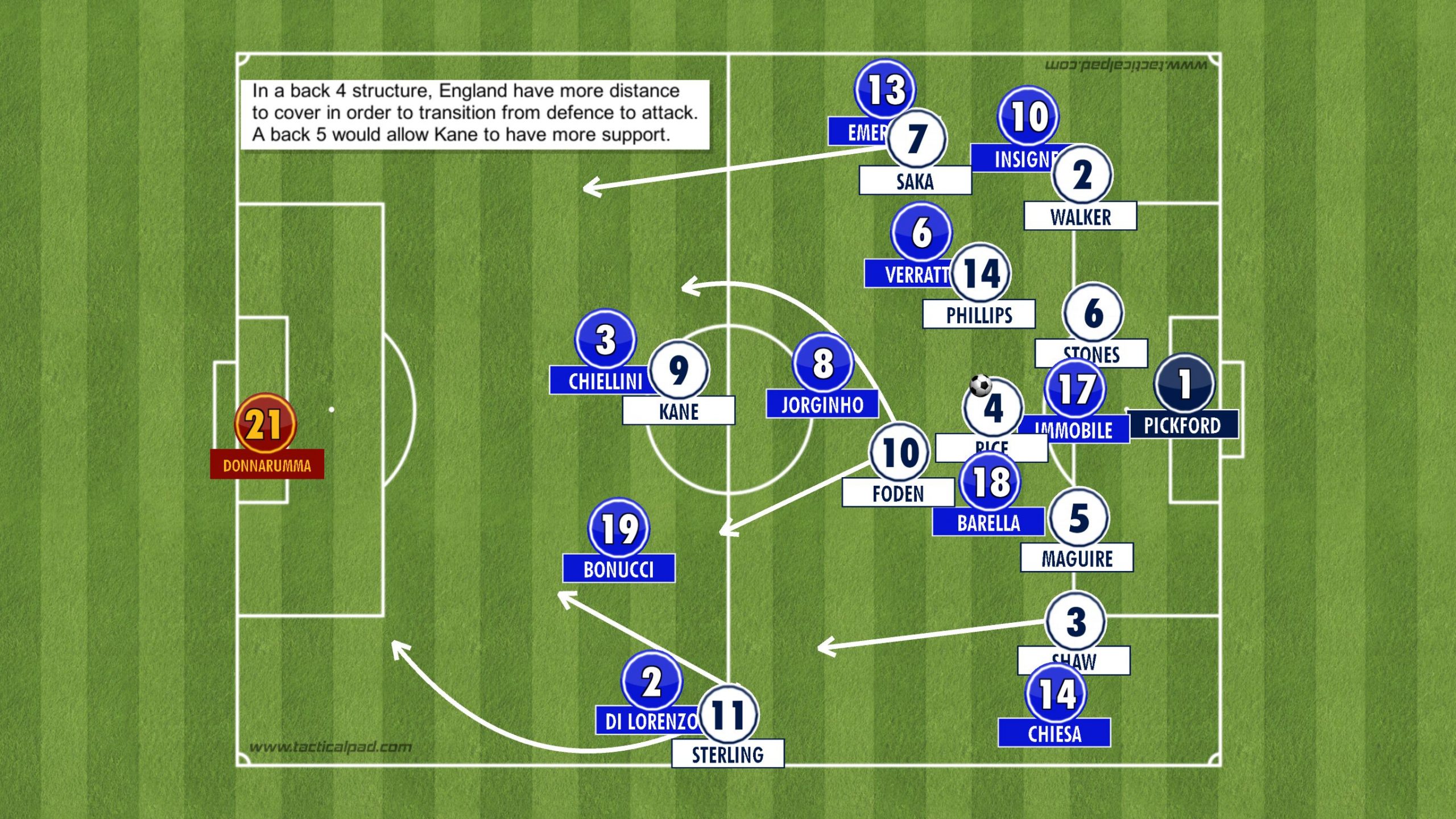 Against a back five, the structure remains the same. The only difference is that the England defenders now mark the Italian attackers man for man, rather than a clear overload. This is likely to be where Italy struggles the most without Spinazzola as a player who is as successful at taking on their marker in a duel is not present, currently.