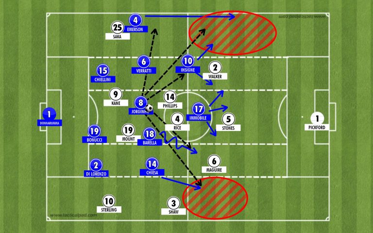 Seeing as Spinazzola is injured, Italy’s most creative player on the left is Emerson. Insigne often joins the forward line with Immobile to form Italy’s front two in their shape out of possession, a 4-4-2, meaning that the player most often found on the ball in the left wide area won’t be Insigne, it will be Emerson.
