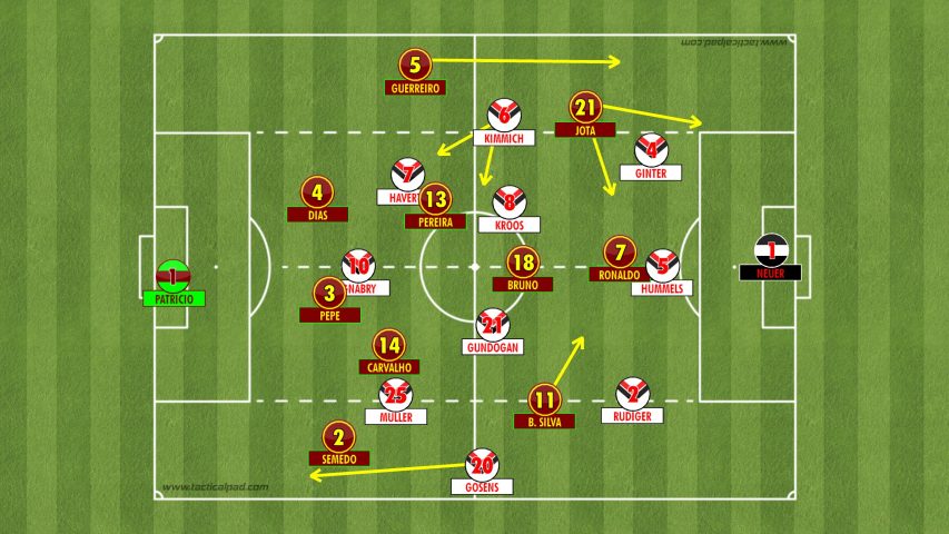 As for Portugal, I think the lack of a natural holder in that German midfield makes Bruno a very important player in this game or even Felix. These two would really hurt Germany just in between their centre backs and the midfield line. Mbappe constantly got into the left half space and pulled out wide causing issues for Ginter and Kimmich .. Jota is a player of a similar tactical profile who could do the same for Portugal.