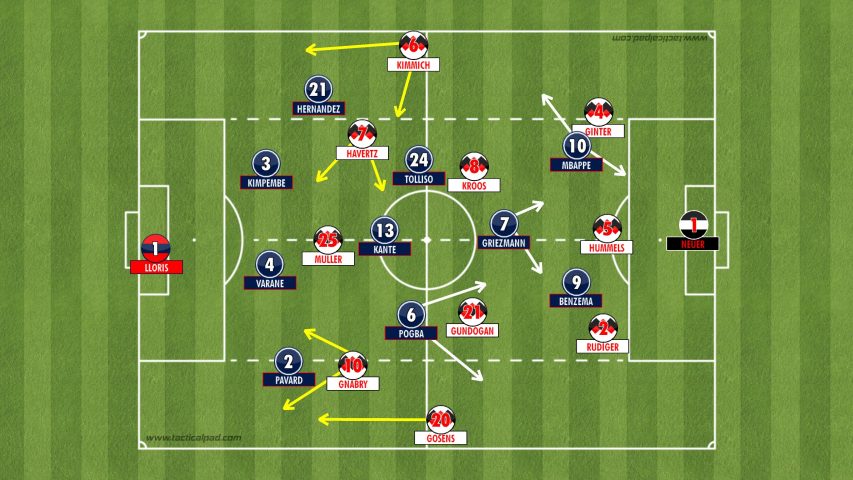 France: Hugo Lloris, Kimpembe, Varane, L. Hernandez, Pavard, Pogba, Kante, Griezmann, K. Mbappe, Tolisso, Benzema