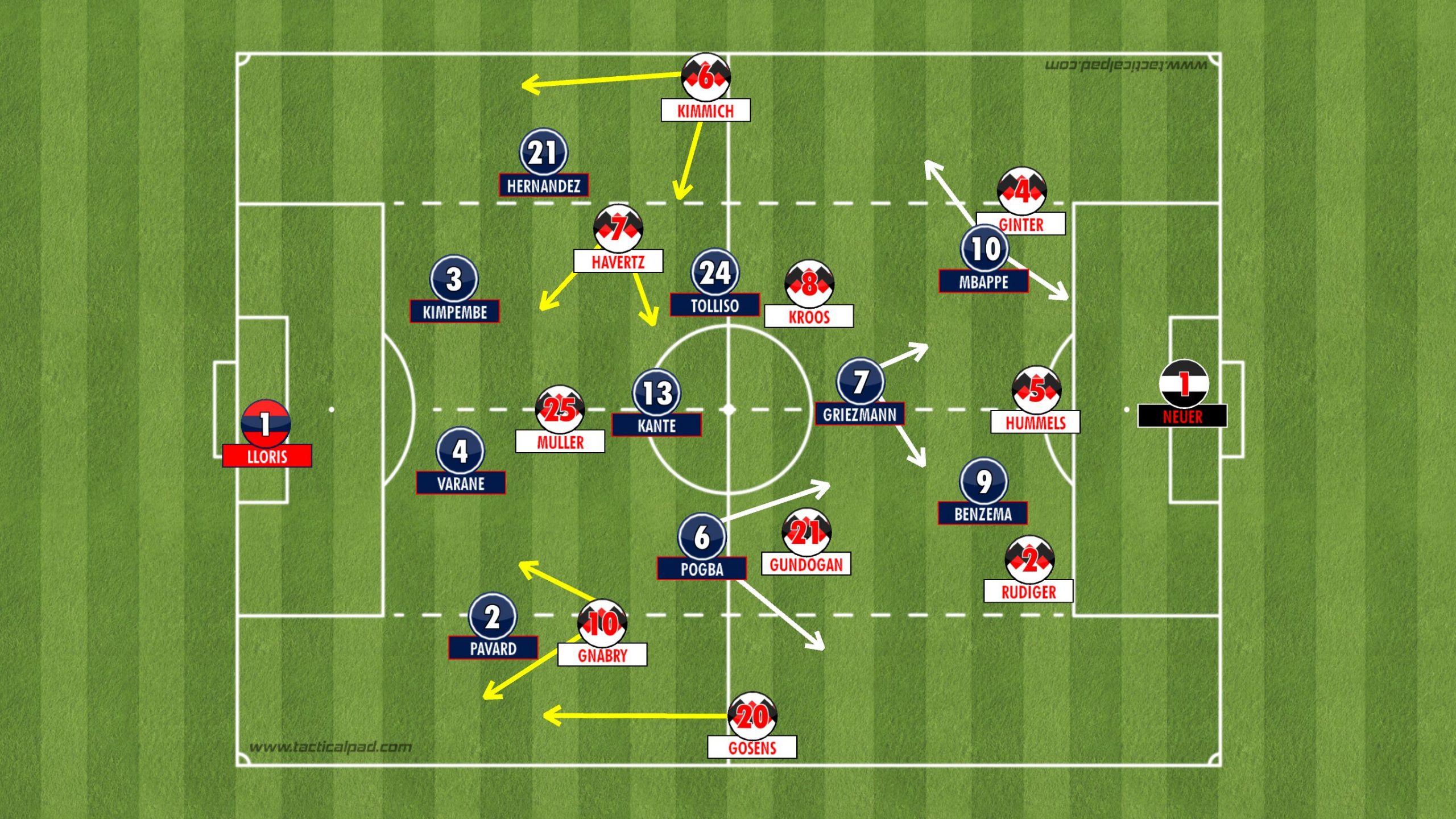 There is a possibility that Low might deploy 3 in the middle of the park to gain more midfield control. Kimmich, Kroos and Gundogan will have a crucial role to play. They will need to display a solid defensive radar with a potent attacking threat in support of the front line. For Deschamps, the approach is simple, stifle the opposition and play on the counter. France will not be keeping too much in terms of possession but they will be using their most potent weapon: Counter attack. Mbappe will be looking to break as quickly as possible and with Ginter, Hummels and Sule in shaky form, he might score a goal or two.