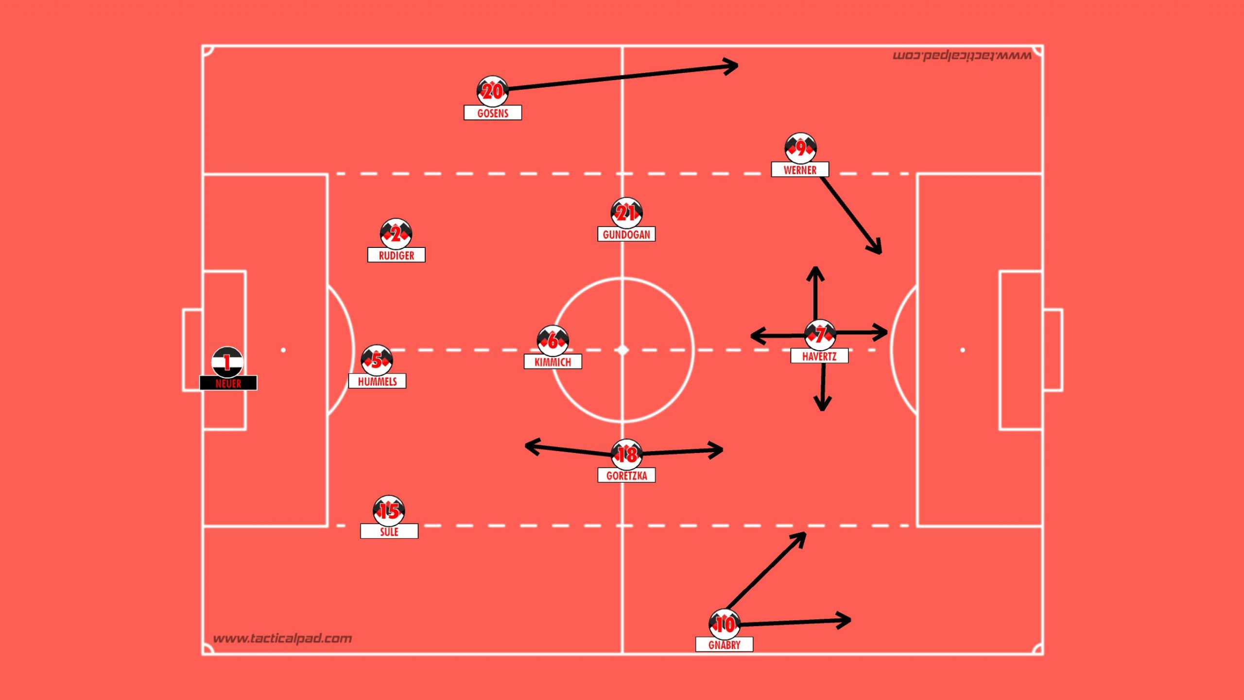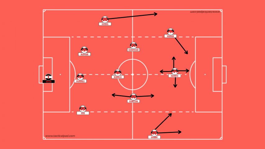 Can, Hummels and Rudiger at the back flanked by Gosens on left and Klostermann/Halstenberg on the right who move forward and join the attack at times providing that width. This allows Kimmich to play a little forward and means Gundogan can make those late runs without the fear of getting outnumbered during attack. It does however leave them without a natural defensive midfielder and leaves the back three exposed to central threats.