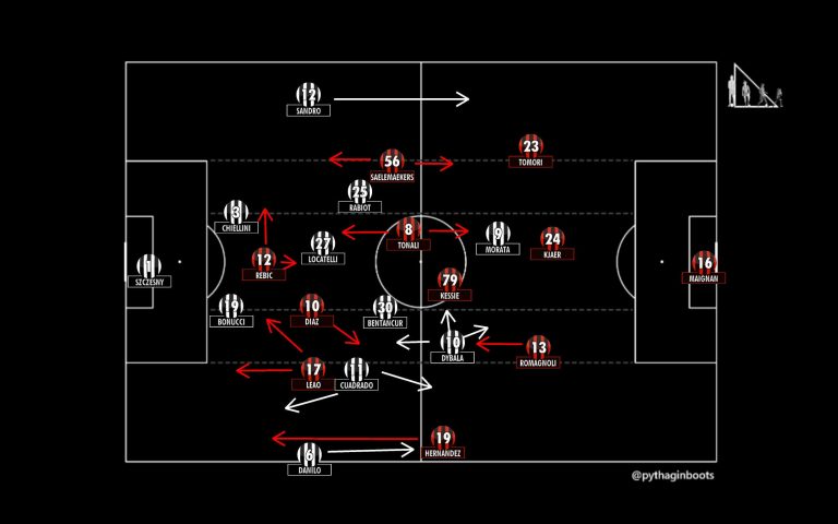 One of the benefits to movements like these is that they surprise the defending team. By the time Kessie has played the pass to Tomori and began his run, Tonali and Rebic are already moving to the space they expect to be left vacant by Kessie’s marker. The attacking team will always have a head start. Should Juventus become aware of this, they would have Locatelli forgo his man-marking so that they could defend the space that would otherwise be available.