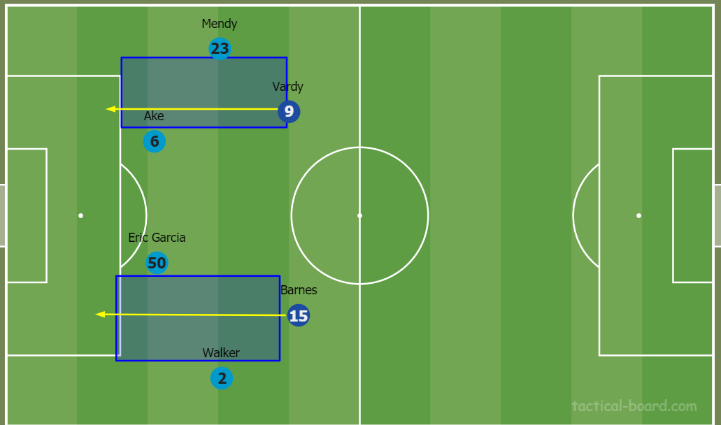 Kyle Walker carried out his tactical responsibilities dutifully but the same could not be said about Benjamin Mendy on the other flank. Whenever he was in possession of the ball, he was pushed backward and forced to recycle the ball back to Rodri or Ake. Walker on the other side was able to penetrate behind Leicester defence at start, but after some time he was well covered and couldn't do much in the game. His accuracy when trying to play long balls to shift flanks became poorer as the match progessed.