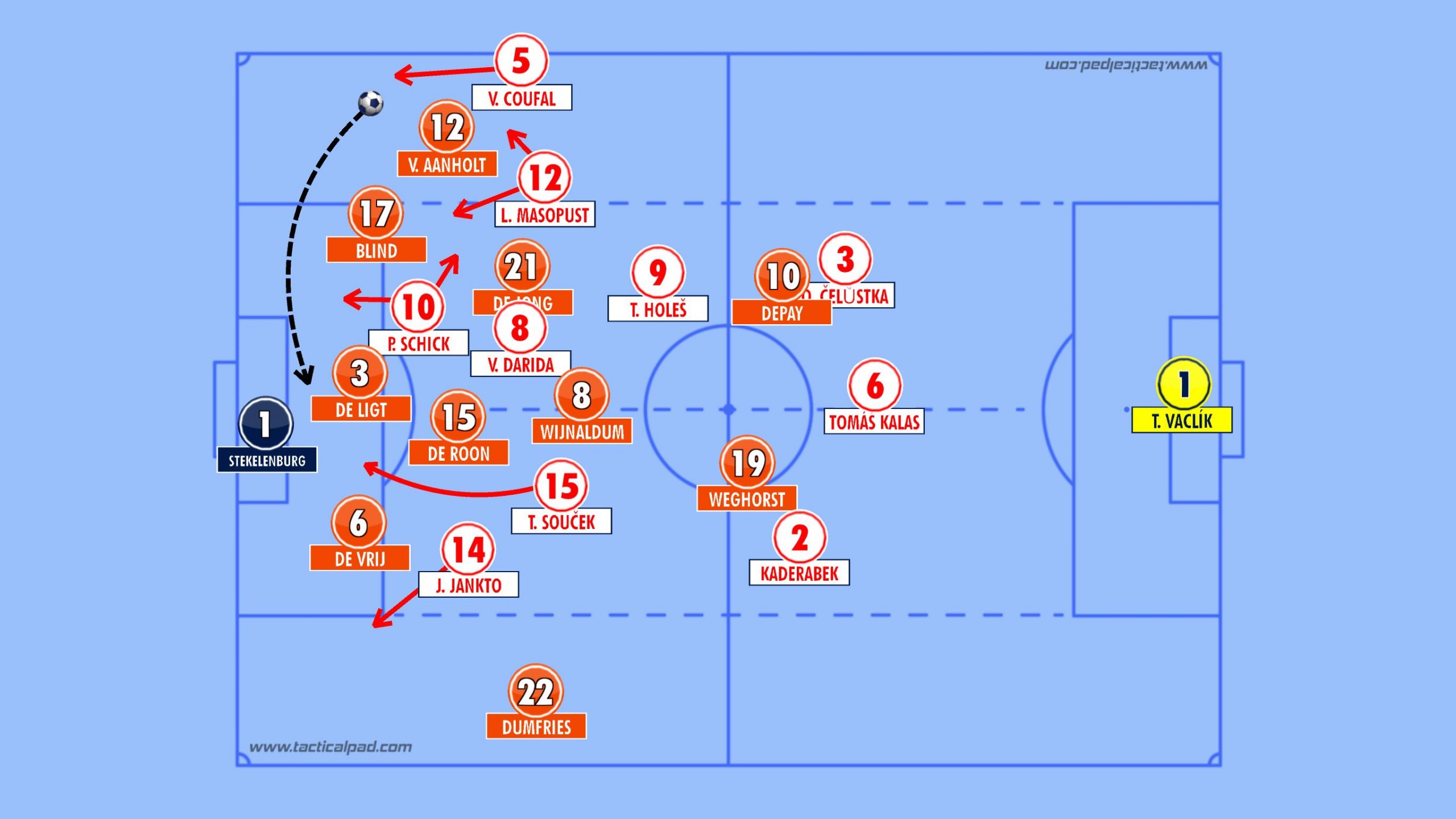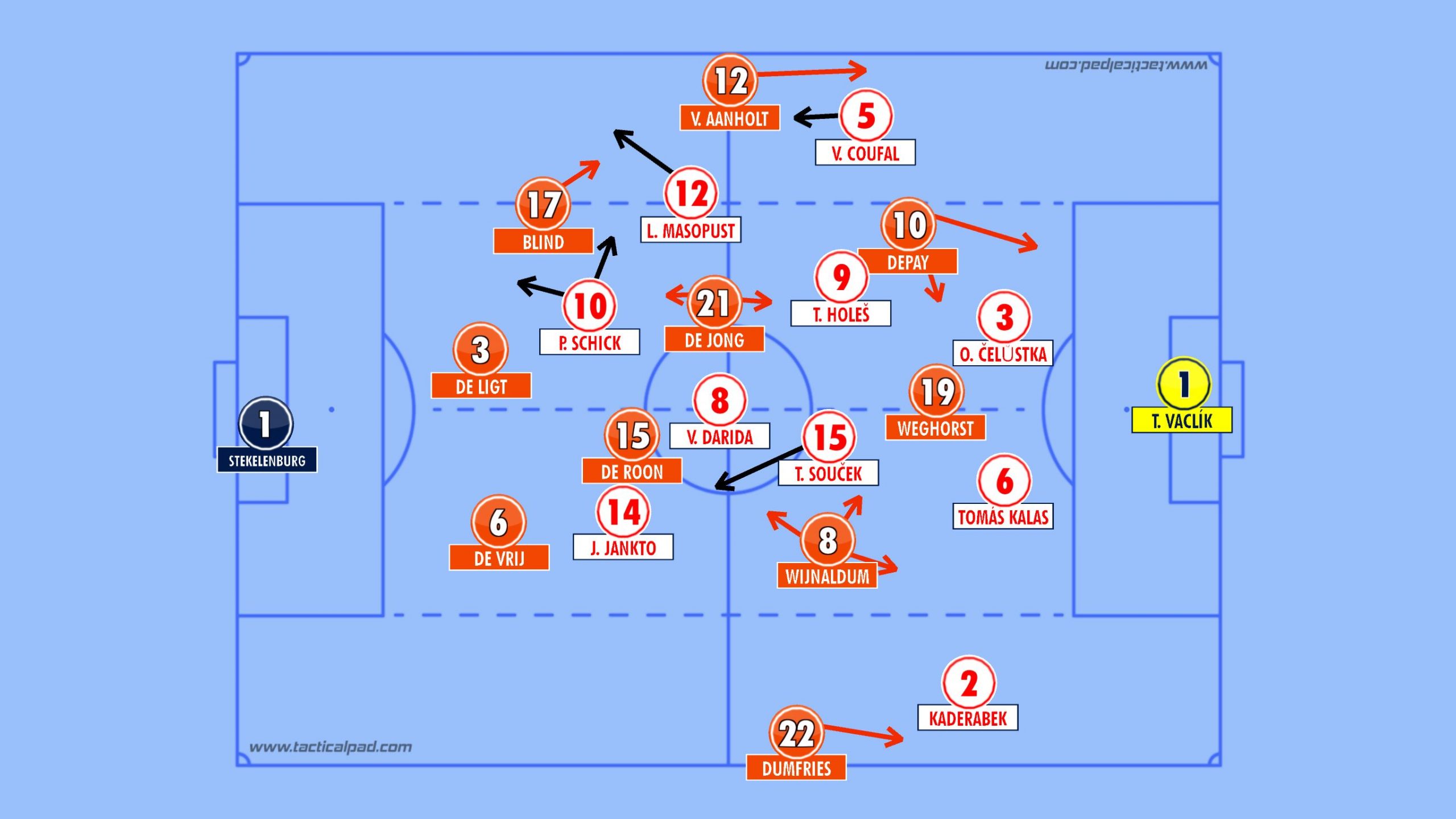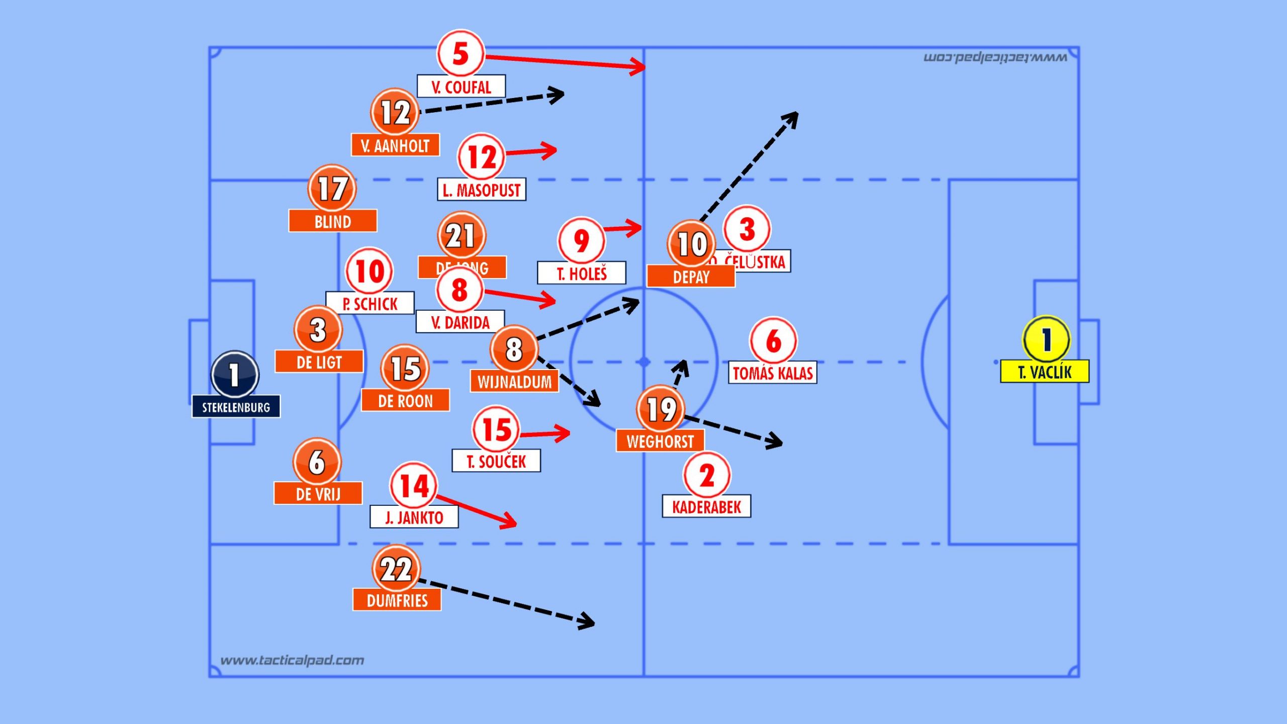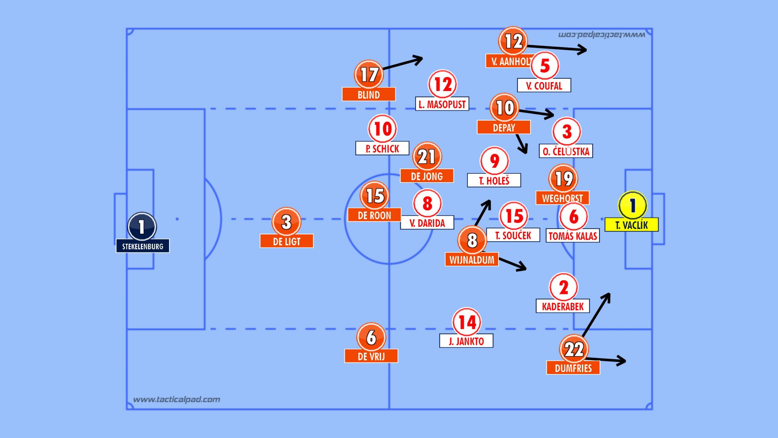 The Czech's are vulnerable down their right flank. Perisic exposed Coufal on several occasions and Robertson was also very dangerous down that flank in their opening game. With Depay, Blind and Van Aanholt operating in tandem down this flank, this seems a strong route to goal for the Dutch.