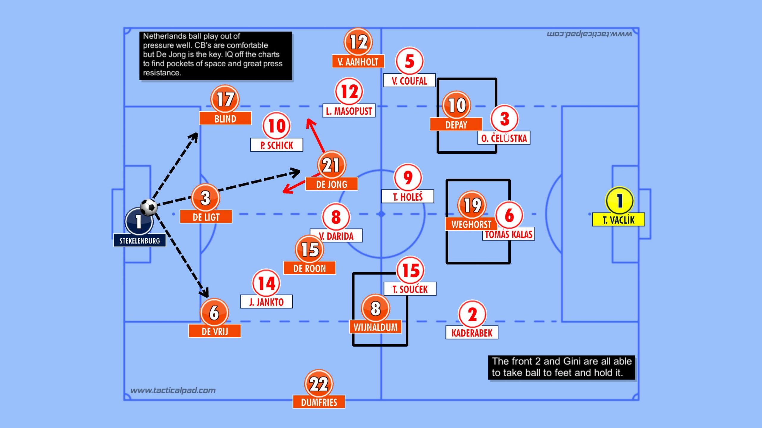 We saw against England that the Czech's were able to exert pressure on Walker, with several crosses to the far post. Fortunately for England, he was more than up to the task but the Dutch defence is not as robust on the far post.. Dumfries is much more attacking in nature than Walker. Aerially, he will not be able to provide any assistance so if the Czech's do flood the box - this could be a potential route to goal for them, especially if Soucek drifts towards that side of the box.